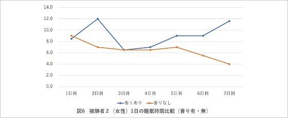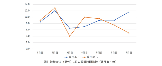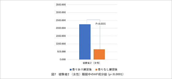 - 被験者1は、デジタル疲労の回復率が高く、練習後の安静時に香りのない時と比べて約4倍回復した。
