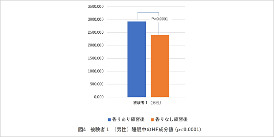 睡眠中のHF(副交感神経活動の指標)成分値が、香りがない時と比べて3倍以上増加し、緊張度が低い状態で眠っていたことが示唆されます。