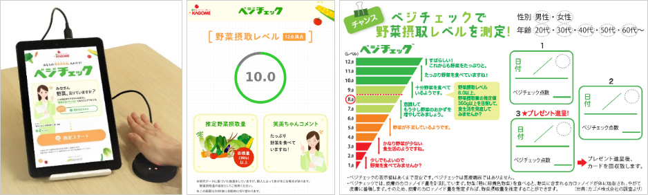 左:ベジチェック®測定風景、中央:ベジチェック®測定結果画面、右:ベジスコアカード