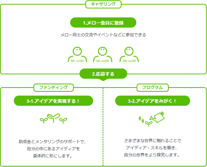 子どもたち(眼の芽×Fellow=ME-LLOW「メロー」と呼称)のコミュニティ「ロートシップ」の中で、自分らしさの探究とそれを磨く機会をサポートいたします。メローはアイデアを実現するための「ファンディング」やアイデアを磨く「プログラム」へ応募することができます。