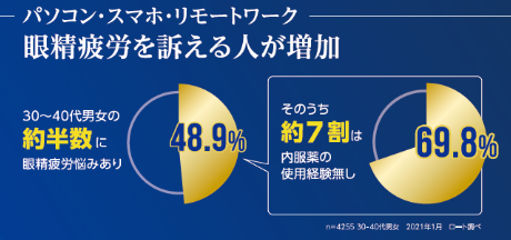 近年、スマホの普及や、コロナ禍でのリモートワークなど、デジタル機器との接触時間が増加しています。当社の調査によると、在宅中心者は一日のデジタル機器接触時間が約11.4時間にものぼることが分かりました※4。また、30代~40代男女の約半数に眼精疲労の悩みがあるものの、そのうち約7割の方は内服薬の使用経験がないことも明らかになりました※5。目の奥まで痛む眼精疲労など、深刻な症状に悩む方が増加している中、その時代の目の悩みに寄り添いながら商品を開発してきたロート製薬から、内側から効く「眼精疲労対策の内服薬」を新発売いたします。