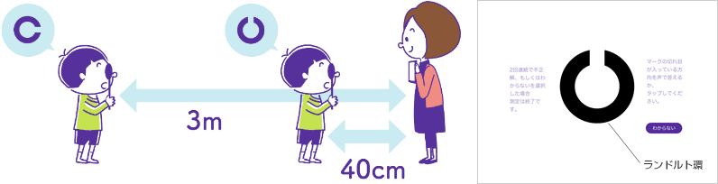 視力測定でよく用いられる「ランドルト環」を使って、遠くを見る視力(3m視力)と、近くを見る視力(40cm)の2種類を測定します。音声入力、タッチ入力が利用できます。