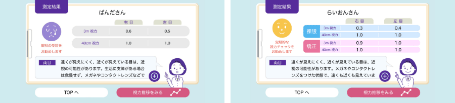 そのため本アプリでは視力測定の数字だけでなく、総合的に判断し、一人ひとりに合わせたコメントが表示されます。