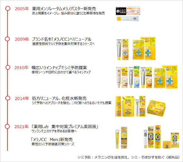 シミ予防などの肌悩みに向け、効き目を追及してきた「メラノCC」は、2005年に「薬用メンソレータムメラノバスター」として誕生。ロート製薬の目薬開発や「オバジ」などのスキンケア研究によるノウハウを踏襲したブランドとして歩んでまいりました。