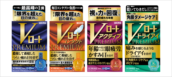 「Vロートプレミアム」シリーズは、長年目薬の研究を続ける中で「蓄積する目の疲れに本気で悩む人に、本当に効く目薬を届けたい」という想いから2016年に誕生しました。目の「蓄積疲労」の原因にアプローチした「Vロートプレミアム」を始めとして、年齢などによる眼疲労、かすみ目※1に効果的な成分を配合した「Vロートアクティブプレミアム」、痛みを感じるようなドライアイ(目の乾き)症状を治す「Vロートドライアイプレミアム」、コンタクトユーザーならではの目の悩みに多角的にアプローチするコンタクト用高機能眼科用薬「Vロートコンタクトプレミアム」をシリーズに加え、時代と共に変化するお客様が抱える目のお悩みに合わせたご提案を重ねてきました。発売開始から今に至るまで、シリーズ4品を通して多くのお客様からご支持を頂いています。
