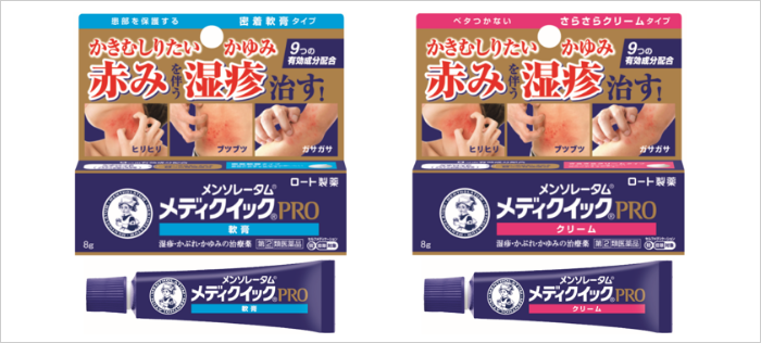 ロート製薬株式会社(本社:大阪市、社長:杉本雅史 以下ロート製薬)は、汗や衣類の擦れなど様々な要因により、首や関節などの部位において、かゆみだけでなく“赤みを伴う湿疹”症状に向け、わかりやすさと治療効果を追求した「メンソレータム®メディクイック®プロ」を新発売します。見た目にも我慢できない症状でお困りにも関わらず、適切な対処にいたっていないお客様へ、わかりやすいパッケージはもちろん、アンテドラッグステロイドと清涼成分を含めた9種の有効成分を配合することで、複数の作用で患部にアプローチします。軟膏とクリームの2品を2022年3月21日(月)より全国の薬局・薬店にて発売いたします。