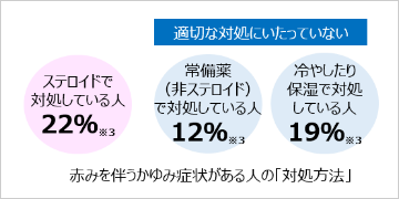 同じ症状を繰り返し、早く治したいにも関わらず、非ステロイドの常備薬や冷やすことで対処するなど、症状の適切な対処に繋がりづらく、ステロイドで素早い対処をしている人は22%※3にとどまりました。そこで、そういったお客様に向けて効き目と選びやすさを追求した「メンソレータムメディクイックプロ」を新発売いたします。
