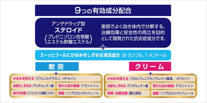 治療効果と安全性の両立した抗炎症成分であるアンテドラッグステロイドに加え、使った瞬間からスーッとクールな使用感で、かゆみを鎮める清涼成分“dl-カンフル”と“l-メントール”を含む、9つの有効成分を配合。つらいかゆみを複数の作用で鎮めるとともに、見た目にもつらい赤みを伴う湿疹のある荒れた肌を修復し、患部を治します。