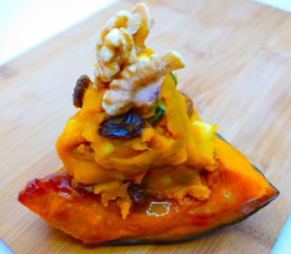 | ほんのりカレー風味でスパイシーな香りと大豆チーズとレーズンで濃厚な味わいに仕立てた、皮まで美味しく食べれるかぼちゃサラダ。ガラムマサラとカレー粉が食欲を刺激します。 |