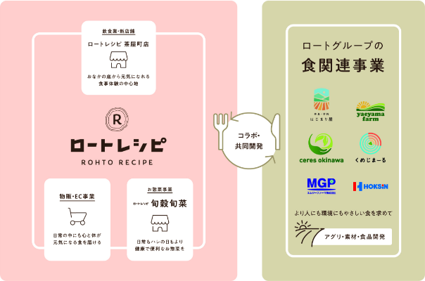そのような状況において、当社は、お客さまの食習慣・文化の変遷と共に行ってきた研究や製品開発、飲食のご提供など、これまで培ってきた技術やノウハウ、叡智を結集させ、様々な「レシピ(=方法)」を用いた新たな食の体験から、人だけでなく社会もサステナブルに、健康的でウェルビーイングな状態を創出します。美味しく、健康的な食事を仲間と楽しく囲むことで「おなかの底から元気になれる。」だけでなく、素材にもこだわることで「おなかの底から社会も元気になれる。」を目指しています。日常の食事、ハレの日の食事など様々なシーンに応じて、飲食のできる複合施設、物販やEC、百貨店での惣菜などをお選びいただきます。また、ロートグループの食関連事業ともシナジーを生み出しながら、様々な取り組みにチャレンジしていきます。
