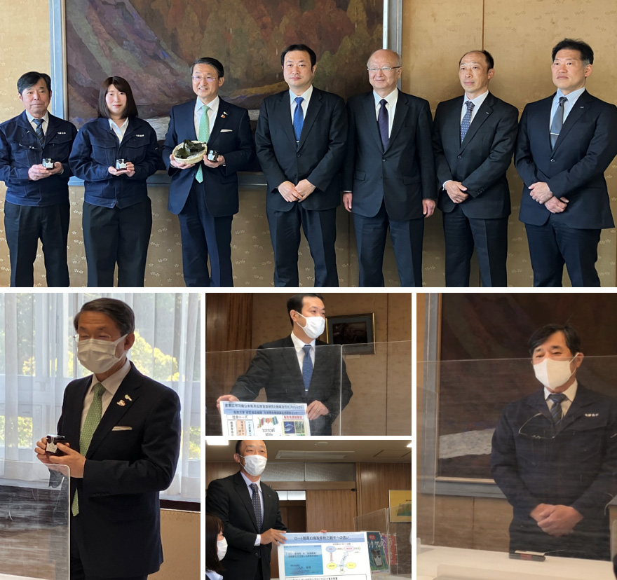 KUROME」(製造販売元:宝福一有限会社(https://takarafukuichi.jp))の完成報告のため、4月28日、平井伸治 鳥取県知事に表敬訪問いたしました。宝福一有限会社からは商品の紹介や商品開発時における工夫、鳥取大学からは未利用・低利用素材の基礎研究について、ロート製薬株式会社からは地域貢献に対する思いや本取り組みの経緯を紹介いたしました。平井知事からは、「幼い頃から海遊びなどで慣れ親しんでいたクロメの魅力を発見していただいこと、また、美味しい食品素材として活用したこと」に感謝のお言葉を頂戴いたしました。また、「シロメ(白目)はむくもの、クロメは食べるもの」という、今後の励みとなるお言葉も頂戴いたしました。