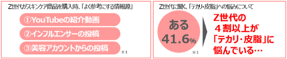 情報に触れる機会が多いといわれるZ世代は、独自の価値観を持ち合わせ、あらゆるコト・モノに対し、その世界観に共感することで購入喚起が高まったり、良いと感じるものにはお金や時間を積極的に投資しするといった特徴が挙げられます。Z世代に向け、スキンケアの考えを調査したところ、購入前に「YouTubeの紹介動画」や、「インフルエンサーによる美容情報の投稿内容」を参考にするなど、情報収集をしっかりと行うという傾向がわかってきました。一方、肌悩みにおいては、「テカリ・皮脂」の悩みがどの世代よりも高く、4割以上※1が悩んでおり、「毛穴」や「ニキビ」に続く高い悩みであることがわかりました。