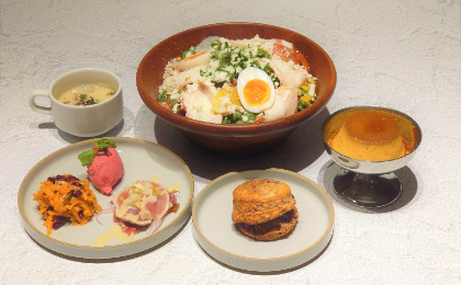 ロートレシピのランチセットで提供している季節のデリ、二十四節季(2週間)ごとに具材が変わる薬膳スープ、ブルーベリー入りスコーンのセット。