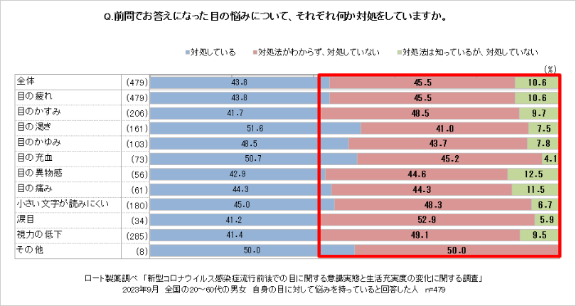 全体の2人に1人が、「目の悩みを抱えている」と回答した一方で、その内の半数は「対処はしていない」と回答