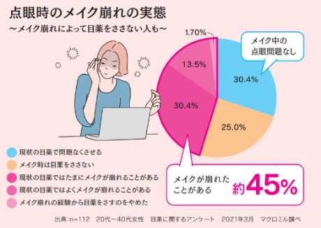 近年、働く環境の変化やデジタルデバイスの長時間使用により、目を取り巻く環境は厳しさを増しています。また、当社が行った目薬に関するアンケート調査※2では、女性(20~40代)の約2人に1人が現状の目薬では「メイクが崩れたことがある」と回答し、点眼時のメイク崩れに不安を感じていることが示唆されました。