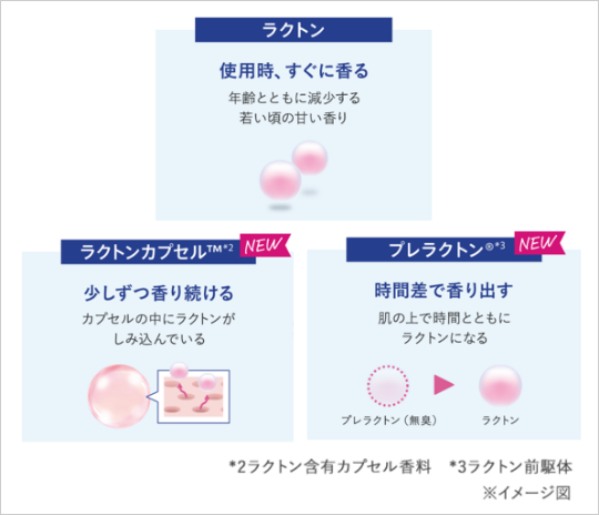 若い女性特有の“甘い香り”の最新研究を応用!新ラクトン含有香料配合で香りの持続力アップ*1!