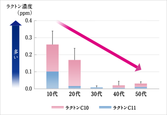 試験方法:体臭中の甘い香りをHSS-GC/MSで分析し同定した結果、ラクトンC10/ラクトンC11であることが分かり、各世代における体臭中のラクトンC10/ラクトンC11濃度を測定し合算した数値をグラフ化した。(n=50