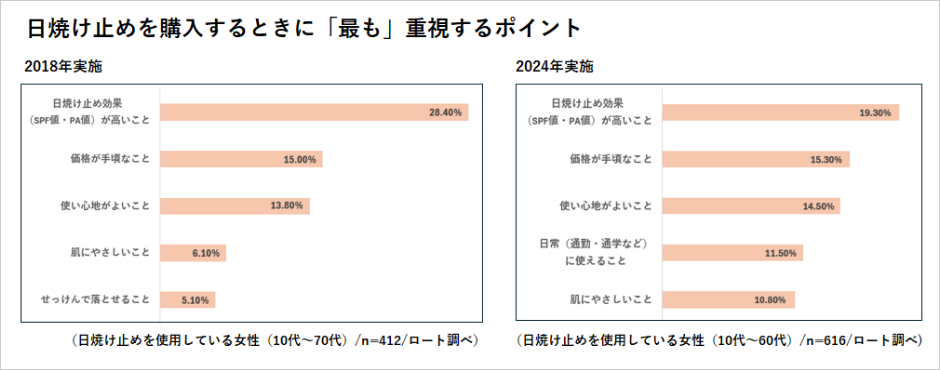 2018年と2024年の「日やけ止め」調査結果を比較したところ、女性が日やけ止めを選ぶ際に重視するポイントが多様化していることがわかりました。「日やけ止め効果」だけでなく、「使い心地」、「肌への優しさ」、「日常使用の利便性」など、さまざまな要素が重視されるようになっています。