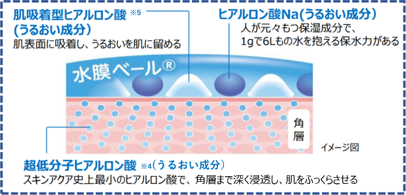 ※1:スキンアクアシリーズ内においてヒアルロン酸(ヒアルロン酸Na、加水分解ヒアルロン酸Na、ヒアルロン酸ヒドロキシプロピルトリモニウム(いずれもうるおい成分))を最高濃度配合していること