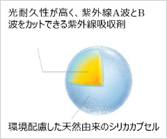 環境に配慮した天然由来成分のシリカカプセルに、紫外線のA波からB波まで幅広い紫外線をブロックし、紫外線などの光によるUVカット機能の低下が起こりにくい成分を配合しました。