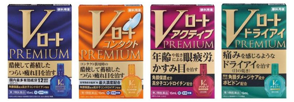 左から「Vロートプレミアム」(第2類医薬品):疲れ目・充血に、「Vロートコンタクトプレミアム」(第3類医薬品):コンタクト装着時の不快感に、「Vロートアクティブプレミアム」(第2類医薬品)」:疲れ目・目やにの多い時などのかすみ目に、「Vロートドライアイプレミアム」(第3類医薬品):目の乾きに