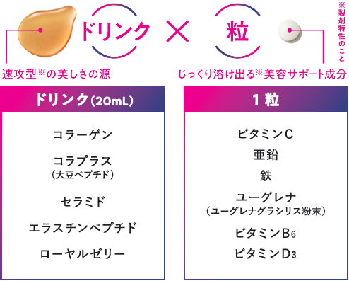 速攻型※2の美しさの源となる成分を“ドリンク”に、じっくり溶け出る※2美容サポート成分を“粒”に含有し、組み合わせることで、成分ごとに溶ける時間をコントロールしました。