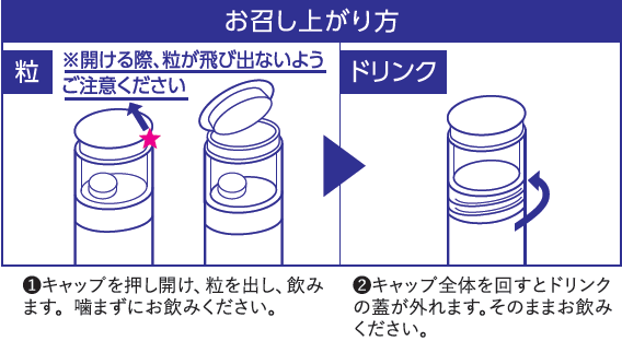 粒とドリンクを一体型の容器におさめた、1日1本と1粒(目安)に手軽に続けやすい形状です。