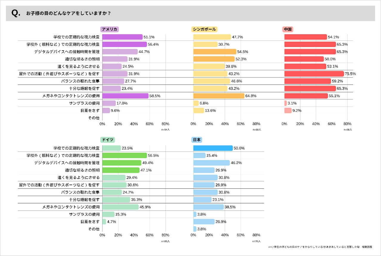 日本の保護者の回答はサンプル数が少ないため参考値ではありますが、「視力検査」「デジタルデバイスへの接触時間管理」への意識があることがうかがえます。
