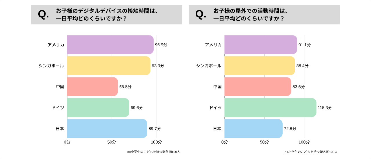 屋外活動時間の平均*4については、アメリカが91.1分、シンガポールが88.4分、中国が83.6分、ドイツが115.3分、日本は72.8分となり、ドイツが長い結果となりました。