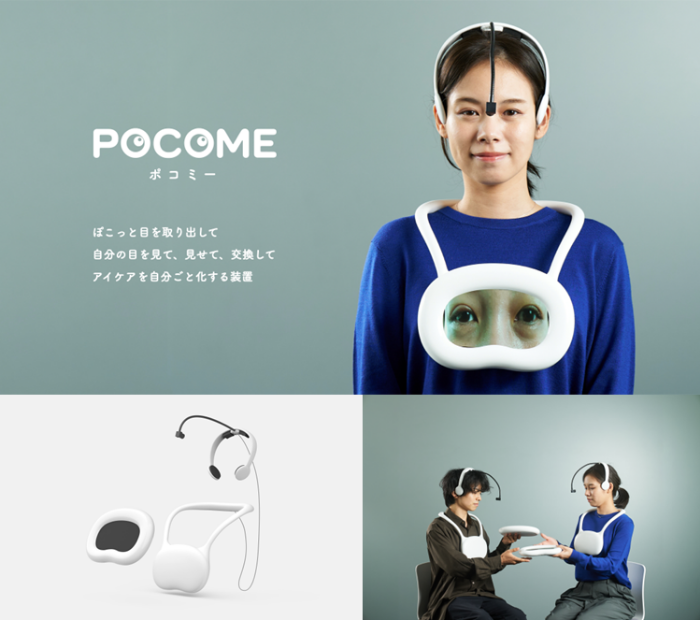 「POCOME」は、ぽこっと目(ME)を取り出すように、外部ディスプレイに目を拡大表示する装置です。体験者の目の動きをリアルタイムに拡大表示し、体験者同士で目を交換したり、自動で瞬きする自分の目を感じるなどの体験を通じて、アイケアを自分ごととして捉えるきっかけを提供します。「POCOME」の制作にあたっては、富士通デザインセンターが筐体からユーザー体験を一貫してデザインしました。