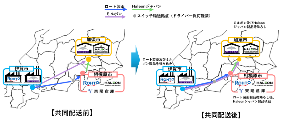 ミルボン:三重県伊賀市の製造拠点であるゆめが丘工場から、埼玉県加須市の倉庫まで製品を輸送。単独での積載効率化の限界や過剰供給リスクなどが課題。
