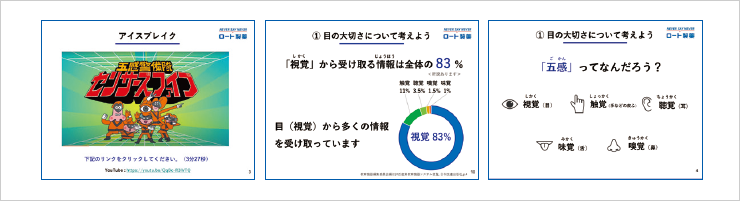 - 「ロートアイケア教材」を活用したアイケア授業の実施:小学校4~6年生を対象に教材を通して目の大切さを自覚し、デジタル機器との適切な付き合い方「アイケア・スキル」を楽しく学ぶプログラムを実施します。