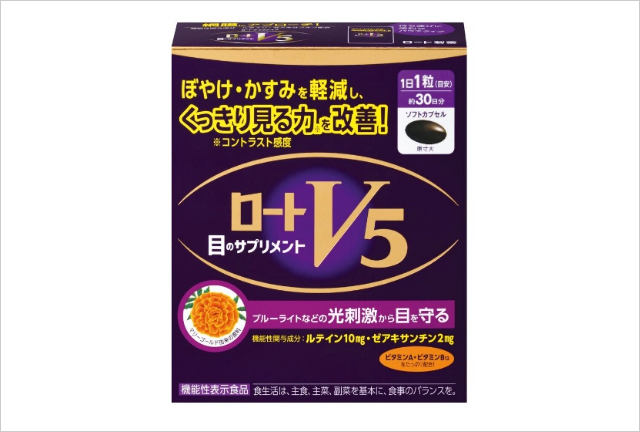 ロートV5シリーズは、年齢とともに目のぼやけ・かすみなどの悩みが出てきた方へのご提案として、2015年に当社初の機能性表示食品として発売した製品シリーズです。ロートV5aは網膜に働きかけ、くっきり見る力※1を改善することが報告されているルテイン・ゼアキサンチンを含有しています。