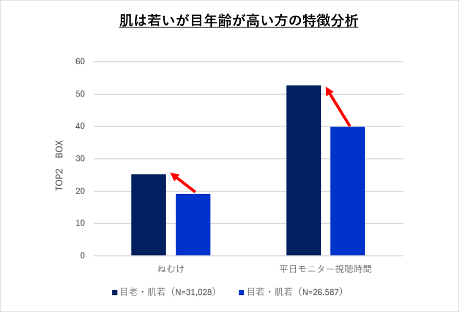 - 肌スコアは若いのに「目」年齢が実年齢より高い方が4割もいて、この層を比較分析すると、日中の眠気を感じている人が多く(TOP2差分:6.0pt)、またモニターの視聴時間が長い(TOP2差分:12.3pt)ことが確認されました。肌が若くても油断大敵。『目』で損をしているかもしれません。モニター視聴時間がもたらしうる『目年齢』の格差が示唆されました。