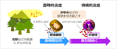 持続的炎症は、好酸球と呼ばれる炎症細胞が結膜に集積することを特徴とし、その炎症は抗原が結膜に侵入してから数日間続くと考えられています。持続的炎症は、好酸球から放出されるロイコトリエン等により長期に渡り目のかゆみ等の症状を引き起こす原因になると考えられています。