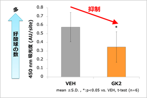 花粉などの抗原が侵入したのちに起きる持続的炎症への作用を評価したところ、GK2を投与したものは持続的炎症の指標となる好酸球が少ないことが初めてわかりました。このことから、GK2は持続的炎症を抑えることが示されました。