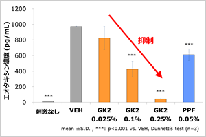<試験方法>ヒト結膜線維芽細胞において、好酸球を集積させるタンパク質であるエオタキシンを産生させる条件下でGK2および0.05%のPPF(現在、一般用点眼薬への配合が確認できた最高濃度)の効果を比較しました。