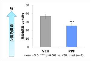 <試験方法>アレルギー性結膜炎モデルを作成しました。炎症が起きると炎症部位が色素で染まることを利用し、発症30分後のVEHおよび0.05%のPPFの色素量をもとに抗炎症効果を比較しました。