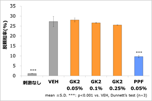 <試験方法>造血幹細胞を採取し肥満細胞に分化させたのち、肥満細胞おけるVEH、GK2および0.05%のPPFの脱顆粒抑制効果を確認しました。