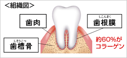 歯根膜は歯と歯槽骨の間に存在する、線維性結合組織です。歯根膜は約60%がコラーゲン線維でできており、そのコラーゲン線維束が歯と歯槽骨を強く連結することで、歯はぐらつかず機能を保つことができます。歯周病が進行すると、コラーゲン線維が慢性的な炎症により破壊されていき、重症の歯周炎では歯がぐらついたり、抜けたりすることもあります。