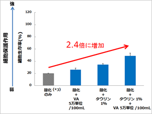 試験方法:マウス角膜上皮前駆細胞(TKE2)に酸化剤(tBOOH)を添加すると、TKE2の細胞生存率が低下する(細胞死が起こる)。このモデルにおいて、TKE2にタウリン、ビタミンA及びその組み合わせで6時間処理した後tBOOHを添加し、4時間処理後の細胞生存率(%)を算出した。このとき、酸化剤を添加していないときの細胞生存率を100%とした。