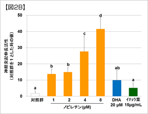 神経細胞分化のモデルであるPC12細胞を用いて、神経突起伸長活性を評価しました。その結果、ノビレチンに、顕著な神経突起伸長活性が認められました(図2A)。さらに、DHAやイチョウ葉とその活性を比較した結果、ノビレチンはこれら成分に比べて高い活性を有することが明らかになりました(図2B)。
