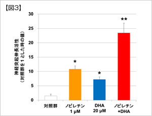 ノビレチンの作用を増強させるような他の食品成分を探索した結果、DHAとの組合せにより相乗効果を示すことが明らかになりました(図3)。
