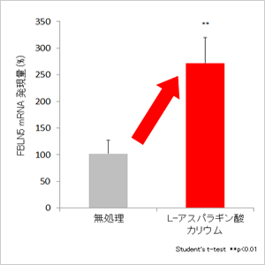 実験方法:0.5%L-アスパラギン酸カリウム溶液をヒト結膜線維芽細胞に作用させ、FBLN5のmRNA発現量(定量的リアルタイムPCR法)を測定した。(n=3、コントロールを100とする)