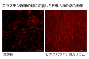 遺伝子レベルで発現誘導されたFBLN5がタンパク質として産生されると、FBLN5はエラスチン線維の軸に沈着し、エラスチン線維を形成していきます。そこで、L-アスパラギン酸カリウムがFBLN5のエラスチン線維の軸への沈着に及ぼす作用について検討しました。その結果、L-アスパラギン酸カリウムは、FBLN5のエラスチン線維の軸への沈着を促進することが分かりました。
