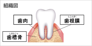 歯根膜は歯と歯槽骨の間に存在する、線維性結合組織です。歯根膜が歯と歯槽骨を強く連結することで、歯はぐらつかず機能を保つことができます。歯周病が進行すると、歯根膜が慢性的な炎症により破壊されていき、重症の歯周炎では歯がぐらついたり、抜けたりすることもあります。