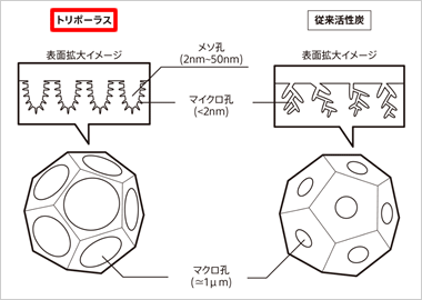 従来の活性炭で確認されるマイクロ孔(2nm以下)に加え、マイクロ孔よりも大きなメソ孔(2~50nm)とマクロ孔(約1μm)が多数複合して存在した独特な微細構造を有しています。
