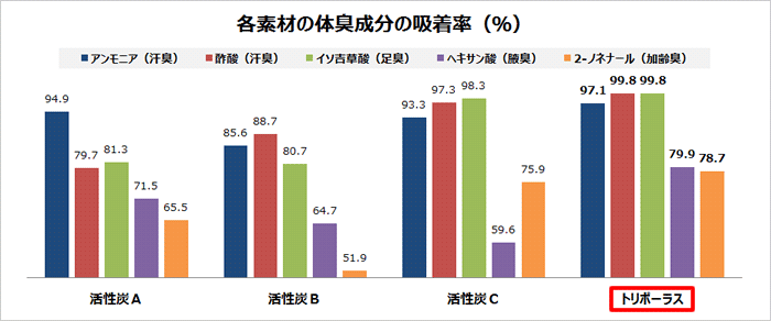 トリポーラスは、既存の活性炭よりも各種体臭成分(汗臭、足臭、腋臭、加齢臭)の吸着率が高く、体臭成分の種類による影響も小さいことが分かりました。
