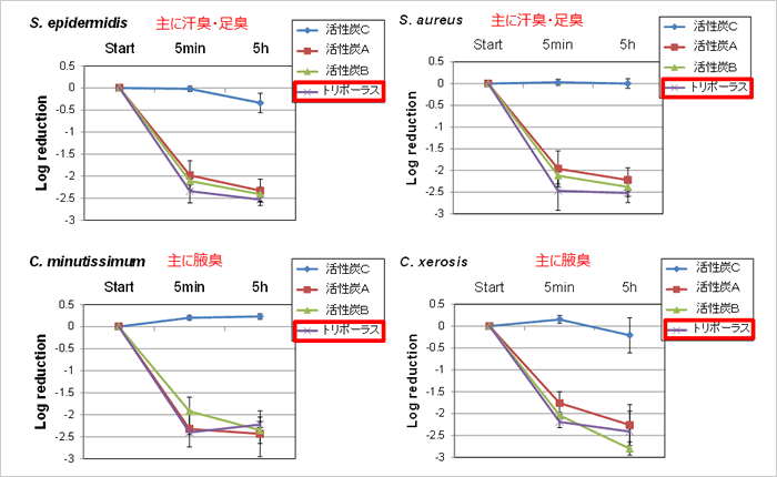 トリポーラスは、既存活性炭A及びBと同じく、既存活性炭Cよりも各種体臭成分の原因菌に対する捕捉効果が高いことが分かりました。