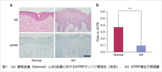 ■図1 健常部位とAD罹患部位より採取した皮膚より切片を作成し、免疫染色法にてKPRPタンパク質の局在を確認した。また各皮膚よりRNAを抽出し、cDNA合成を行った後、リアルタイムPCR法にてKPRP遺伝子の発現量を比較した。(n=4, **:P<0.01, Mann-Whitney U test)